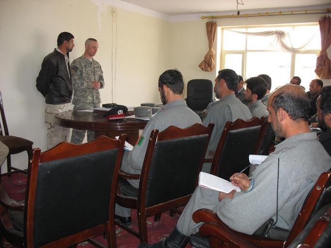 Keywords: Afghan National Police graduate new leaders DVIDS40573.jpg en Army Spc Ethan Smith 201st Military Police Company 1st Platoon teaches a radio communications class to Afghan national police leaders during a Afghan Leadership Skills Seminar April 4 Police chiefs from seven districts across the Kapisa Province received classroom instruction on ethics/values leadership community policing map reading running a tactical operations center basic communication hygiene and logistics Completion of this course made them the first Afghan police leaders to complete this type of training U S Air Force photo by Staff Sgt Oshawn Jefferson 2007-04-04 https //www dvidshub net/image/40573 40573 2007-04-05 14 32 BAGRAM AIR FIELD AF PD-USGov Bagram Air Base Images from DoD uploaded by Fæ |