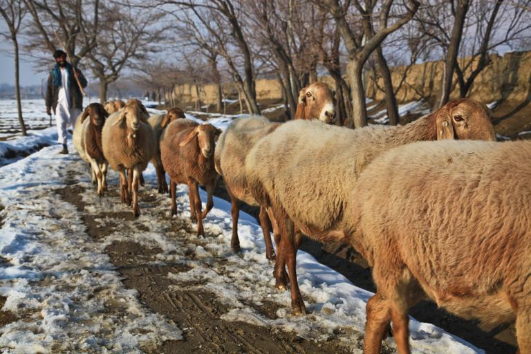 Keywords: afghanistan shepherd sheep flock winter cold muddy village wool