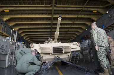 | Keywords: AFOE portion of Ssang Yong 16 160315-N-RM689-108.jpg en 160315-N-RM689-108 EAST SEA March 15 2016 - Sailors assigned to Landing Craft Air Cushion 10 LCAC 10 attached to Naval Beach Unit 7 secure an M1A1 Abram tank attached to Delta Company 1st Tank Battalion 1st U S Marine Division to the LCAC to prepare for the Assault Follow-On Echelon AFOE portion of Ssang Yong 16 Ashland is assigned to the Bonhomme Richard Expeditionary Strike Group and is participating in Ssang Yong 16 a biennial combined amphibious exercise conducted by forward-deployed U S forces with the Republic of Korea navy and Marine Corps Australian army and Royal New Zealand army forces in order to strengthen our interoperability and working relationships across a wide range of military operations-from disaster relief to complex expeditionary operations U S Navy photo by Mass Communication Specialist Seaman Kelsey L Adams/Released <br>Unit Navy Public Affairs Support Element West 2016-03-15 Seaman Kelsey Adams https //www dvidshub net/image/2478343/afoe-portion-ssang-yong-16 160315-N-RM689-108 2016-03-22 05 58 EAST SEA USS ASHLAND AT SEA PD-USGov-Military-Navy LCAC-10 ship 1987 Images from DoD uploaded by Fæ |