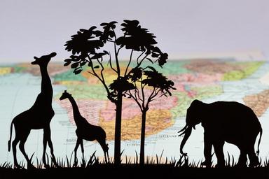 Keywords: africa silhouette laser cut giraffe tree elephant savannah black nature atlas two-page spread