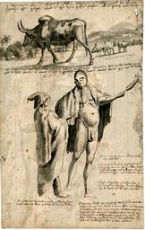 | Keywords: African Ox and Khoi Couple WDL11264.png Artwork ru Аф иканский буйвол и Па а кой-коин fr Un bœuf africain et un couple khoï en African Ox and Khoi Couple zh 洲牛和科伊情侣 pt Boi africano e casal Khoi ar الثور الأفريقي وزوج من الخُوْي ru Эти два наб оска изоб ажающие аф иканского буйвола и па у кой-коин входят в коллекцию из 27 исунков на 15 листах обна уженных в 1986 г в ациональной библиотеке Южной Аф ики Ценность этих исунков заключается в том что они соде жат самые анние еалистичные изоб ажения п едставителей на одности кой-коин ко енных жителей Западно-Капской п овинции В коммента иях к исункам п иведены сведения об аф иканском огатом скоте и о азличиях в одежде мужчин и женщин на одности кой-коин Рогатый скот азведением кото ого занимались кой-коин относится к г уппе по од санга об азовавшейся в езультате ск ещивания местных по од дикого огатого скота обитавшего в Севе ной Аф ике и пустыне Саха а 8000 лет назад с го батыми зебу завезенными в Аф ику из Азии более 2000 лет назад Входящие в коллекцию исунки были сделаны с нату ы и в отличие от большинства немногочисленных анних ев опейских изоб ажений п едставителей кой-коин никогда не инте п ети овались ев опейскими иллюст ато ами По всей ве оятности исунки выполнены одившимся в XVII веке голландцем кото ый по оду деятельности был связан с Голландской Ост-Индской компанией а возле ыса Доб ой адежды оказался по пути в Голландскую Ост-Индию или об атно в иде ланды Есть основания полагать что названные исунки были созданы не позднее 1713 г а быть может и го аздо аньше Большинство из них соде жат п имечания на голландском языке добавленные после 1730 г д угим человеком имя кото ого также остается неизвестным <br> ыс Доб ой адежды; К упный огатый скот; Одежда и платье; Ко енные на одности; Кой-коин аф иканский на од ; Волы fr Ces deux esquisses représentant un bœuf africain et un couple khoï font partie d un ensemble de 27 dessins sur 15 feuilles qui a été découvert à la Bibliothèque nationale d Afrique du Sud en 1986 L importance des dessins réside dans l illustration des premières représentations réalistes des Khoïkhoï les premiers habitants du Cap-Occidental Les annotations fournissent des détails sur le bétail africain et les différences entre les habits des hommes et des femmes khoï Le bétail des Khoïkhoï appartient à la race Sanga qui est le résultat du métissage des bovins indigènes sauvages trouvés en Afrique du Nord et au Sahara il y a 8000 ans avec le zébu importé d'Asie il y a plus de 2000 ans Les dessins de la collection ont été réalisés <em>in situ</em> et contrairement à la plupart des premières représentations européennes des Khoïkhoï ils ne furent jamais réinterprétés par les graveurs européens L artiste était fort probablement un Néerlandais né au XVIIe siècle qui occupait une certaine fonction à la Compagnie néerlandaise des Indes orientales Il se dirigeait vraisemblablement vers les Indes orientales néerlandaises ou rentrait aux Pays-Bas quand il a visité le Cap Des indications laissent à supposer que les dessins ont été réalisés au plus tard en 1713 et probablement même beaucoup plus tôt La plupart des dessins portent des annotations faites après 1730 par une autre personne elle aussi non identifiée <br>Cap de Bonne-Espérance; Bétail; Vêtements et habits; Peuples autochtones; Khoïkhoï peuple africain ; Bœufs en These two sketches depicting an African ox and a Khoi couple are from a set of 27 drawings on 15 sheets that was discovered in the National Library of South Africa in 1986 The drawings are important for presenting the earliest realistic depictions of the Khoikhoi the original inhabitants of the Western Cape The annotations provide details about African cattle and about the differing dress worn by Khoi men and women The cattle owned by the Khoikhoi were of the Sanga breeds which resulted from the interbreeding of the indigenous wild cattle found in North Africa and the Sahara 8 000 years ago with the humped Zebu introduced to Africa from Asia more than 2 000 years ago The drawings in the collection were made <em>in situ</em> and unlike most of the few early European depictions of the Khoikhoi were never filtered through the eyes of European engravers The artist most likely was a Dutchman born in the 17th century who was attached in some capacity to the Dutch East India Company and possibly en route to the Dutch East Indies or on his way back to the Netherlands when he visited the Cape Evidence suggests that the drawings were made no later than 1713 and possibly a good deal earlier Most of the drawings have annotations in Dutch made by another person also un