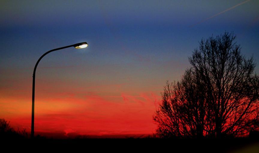 Keywords: afterglow evening sky sunset abendstimmung sky evening lantern street light twilight atmosphere dusk trees mood light red road branches dramatic sky color farbenspiel colorful blue