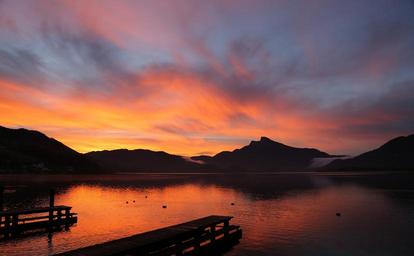 Keywords: afterglow lake sunset evening abendstimmung landscape romantic sky water evening sky clouds reflection bank orange sun wave beautiful rest dusk mirroring evening sun shadow mondsee mountains holiday light outlook dark red