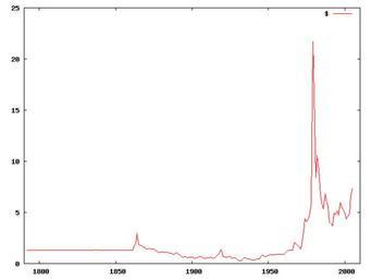 | Keywords: Ag annual average USD price 1792-2005.png Ag_annual_average_USD_price_1792-2005 svg Historic annual average price of an ounce of silver in USD Data from kitco new plot made with gnuplot <pre> 1792 1 293 1836 1 293 1837 1 35 1838 1 296 1840 1 296 1841 1 292 1842 1 293 1843 1 292 1856 1 292 1857 1 294 1858 1 292 1861 1 292 1862 1 709 1863 1 952 1864 2 939 1865 1 889 1866 1 766 1867 1 741 1868 1 569 1869 1 569 1870 1 430 1871 1 412 1872 1 449 1873 1 421 1874 1 411 1875 1 394 1876 1 315 1877 1 212 1878 1 1 1879 1 144 1880 1 116 1881 1 129 1882 1 099 1883 1 11 1884 1 084 1885 1 032 1886 1 006 1887 0 970 1888 0 936 1889 0 959 1890 1 056 1891 0 956 1892 0 840 1893 0 703 1894 0 615 1895 0 677 1896 0 664 1897 0 590 1898 0 603 1899 0 6 1900 0 648 1901 0 558 1902 0 487 1903 0 560 1904 0 612 1905 0 655 1906 0 696 1907 0 552 1908 0 494 1909 0 529 1910 0 553 1911 0 556 1912 0 640 1913 0 584 1914 0 503 1915 0 561 1916 0 758 1917 0 899 1918 1 019 1919 1 336 1920 0 655 1921 0 663 1922 0 643 1923 0 650 1924 0 692 1925 0 692 1926 0 538 1927 0 583 1928 0 577 1929 0 488 1930 0 330 1931 0 304 1932 0 254 1933 0 437 1934 0 544 1935 0 584 1936 0 454 1937 0 438 1938 0 428 1939 0 350 1940 0 348 1941 0 351 1942 0 448 1943 0 448 1944 0 448 1945 0 708 1946 0 867 1947 0 746 1948 0 700 1949 0 733 1950 0 8 1951 0 88 1952 0 833 1953 0 853 1954 0 853 1955 0 905 1956 0 914 1957 0 898 1958 0 899 1959 0 914 1960 0 914 1961 1 033 1962 1 199 1963 1 293 1966 1 293 1967 2 06 1968 1 959 1969 1 807 1970 1 635 1971 1 394 1972 1 976 1973 3 137 1974 4 391 1975 4 085 1976 4 347 1977 4 706 1978 5 93 1979 21 693 1980 16 393 1981 8 432 1982 10 586 1983 9 121 1984 6 694 1985 5 888 1986 5 364 1987 6 79 1988 6 108 1989 5 543 1990 4 068 1991 3 909 1992 3 71 1993 4 968 1994 4 769 1995 5 148 1996 4 73 1997 5 945 1998 5 549 1999 5 218 2000 4 951 2001 4 370 2002 4 600 2003 4 876 2004 6 671 2005 7 316 </pre> Silver price charts Natural resources Economic statistics |