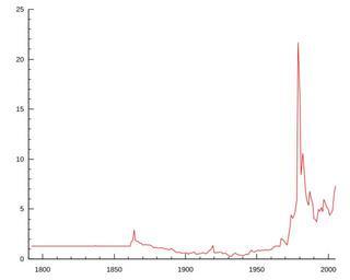 | Keywords: Ag annual average USD price 1792-2005.svg SVG version of Ag_annual_average_USD_price_1792-2005 png Made in gnuplot From original image Historic annual average price of an ounce of silver in USD Data from kitco new plot made with gnuplot 2007-04-28 own assumed Ankurdave Companies of Hong Kong Securities Silver price charts |