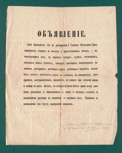 Keywords: AGAD (10) Obwieszczenie o zakazie rozmawiania po polsku, PudÅ‚o 663, s 121.png Obwieszczenie informujÄ…ce o wprowadzeniu na mocy rozporzÄ…dzenia generaÅ‚-gubernatora wileÅ„skiego zakazu prowadzenia rozmów w jÄ™zyku polskim we wszystkich miejscach publicznych Po upadku powstania styczniowego od poÅ‚owy lat 60 XIX w wÅ‚adze rosyjskie zaczęły znosić odrÄ™bność ustrojowÄ… Królestwa Polskiego Likwidowano urzÄ™dy odrÄ™bne dla Królestwa a miejscowa administracja podporzÄ…dkowana zostaÅ‚a ministerstwom rosyjskim Unifikacja ta byÅ‚a jednak niepeÅ‚na ograniczono jÄ… do wprowadzenia szczególnych rygorów politycznych i policyjnych natomiast nie wprowadzono w Królestwie Polskim liberalnych reform które miaÅ‚y miejsce w Cesarstwie samorzÄ…dowej i sÄ…downiczej Polityka rusyfikacyjna na WileÅ„szczyźnie miaÅ‚a znacznie ostrzejszy charakter niż w Królestwie Polskim GeneraÅ‚-gubernator wileÅ„ski MichaiÅ‚ Murawiow ze wzglÄ™du na swe okrucieÅ„stwo w tÅ‚umieniu powstania styczniowego zwany žWieszatielem aby po stÅ‚umieniu powstania styczniowego nadać “ przynajmniej zewnÄ™trznie “ czysto rosyjski charakter guberniom zachodnim cesarstwa rosyjskiego wydaÅ‚ 5 IV 1864 r rozporzÄ…dzenie nakazujÄ…ce używanie wyłącznie jÄ™zyka rosyjskiego na szyldach sklepowych oraz w prowadzeniu rachunków i ksiÄ…g kupieckich W tym samym roku zakazano w wileÅ„skich szkoÅ‚ach nauki jÄ™zyka polskiego nawet jako przedmiotu nadobowiÄ…zkowego oraz zamkniÄ™to polskie czytelnie Kolejni generaÅ‚-gubernatorzy wileÅ„scy kontynuowali rusyfikacyjnÄ… politykÄ™ Murawiowa Od 3 XI 1865 r obowiÄ…zywaÅ‚ na Litwie wprowadzony przez generaÅ‚-gubernatora Kaufmana zakaz noszenia strojów polskich i używania zaprzÄ™gów konnych w stylu polskim 21 VIII 1868 r generaÅ‚-gubernator Potapow wprowadziÅ‚ zakaz mówienia po polsku w miejscach publicznych o czym podano do wiadomoÅ›ci w obwieszczeniu rozklejanym na murach miasta Obwieszczenie informowaÅ‚o o wprowadzonym zakazie posÅ‚ugiwania siÄ™ jÄ™zykiem polskim w miejscach publicznych Miejsca w których ów zakaz obowiÄ…zywaÅ‚ zostaÅ‚y szczegółowo wymienione w obwieszczeniu ZnalazÅ‚y siÄ™ wÅ›ród nich urzÄ™dy paÅ„stwowe koÅ›cioÅ‚y teatry kluby hotele i zajazdy restauracje kawiarnie piwiarnie winiarnie wszelkiego rodzaju punkty handlowe Zakaz objÄ…Å‚ także parki i ulice Wymieniono również drukarnie zakÅ‚ady litograficzne i fotograficzne Pomimo szczegółowego okreslenia wszelkich możliwych miejsc publicznych w obwieszczeniu dodano także sÅ‚owa ž ¦ i w ogóle we wszystkich miejscach do których ludność ma prawo wstÄ™pu ¦ a także w sytuacjach prywatnych z wyjÄ…tkiem rozmów domowych i w rodzinnym krÄ™gu Zastrzeżone też zostaÅ‚o że winni naruszenia wprowadzonego zakazu bÄ™dÄ… podlegali karom Pomimo zapowiadanych restrykcji wÅ‚adzom nie udaÅ‚o siÄ™ wyegzekwować wprowadzonego obowiÄ…zku używania jÄ™zyka rosyjskiego w kazaniach i Å›piewach koÅ›cielnych WÅ‚adze rosyjskie w Królestwie Polskim nie przystÄ…piÅ‚y do rusyfikacji w sposób aż tak represyjny Choć pojawiÅ‚y siÄ™ pomysÅ‚y by również w Królestwie zakazać np wszelkich publikacji w jÄ™zyku polskim nie doszÅ‚o do realizacji podobnych rozporzÄ…dzeÅ„ Zakres używania jÄ™zyka polskiego ograniczono jednak bardzo znacznie Stopniowo rusyfikowane byÅ‚o szkolnictwo; w drugiej poÅ‚owie lat 60 XIX w wprowadzono do szkół Å›rednich jÄ™zyk rosyjski jako wykÅ‚adowy a od 1885 “ także do szkół elementarnych Warszawska SzkoÅ‚a Główna zostaÅ‚a zamkniÄ™ta w 1869 r a na jej miejsce utworzono cesarski uniwersytet Ponadto obowiÄ…zywaÅ‚a w Królestwie surowa cenzura a stan wojenny ogÅ‚oszony jeszcze w 1861 r obowiÄ…zywaÅ‚ w dalszym ciÄ…gu Od Å›mierci w 1874 r namiestnika Królestwa Fiodora Berga nie powoÅ‚ano już nikogo na to stanowisko a krajem rzÄ…dzili generaÅ‚-gubernatorzy Stopniowo zaprzestano używania nazwy Królestwo Polskie; zastÄ…piono jÄ… okreÅ›leniem žKraj PrzywiÅ›laÅ„ski <br/> opis zewnÄ™trzny Druk jÄ™z rosyjski 1 karta papierowa o wymiarach 351x436 mm<br/> miejsce przechowywania Biblioteka Polska w Paryżu RzÄ…d Narodowy powstania 1863-1864 Archiwum Izby Obrachunkowej sygn 663 s 121 <br/> autor komentarza Alicja Nowak 1868-08-21 Archiwum Główne Akt Dawnych ze zbiorów Biblioteki Polskiej w Paryżu author PD-old January Uprising documents Media contributed by AGAD presented in former polska pl portal Uploaded with VicuñaUploader |