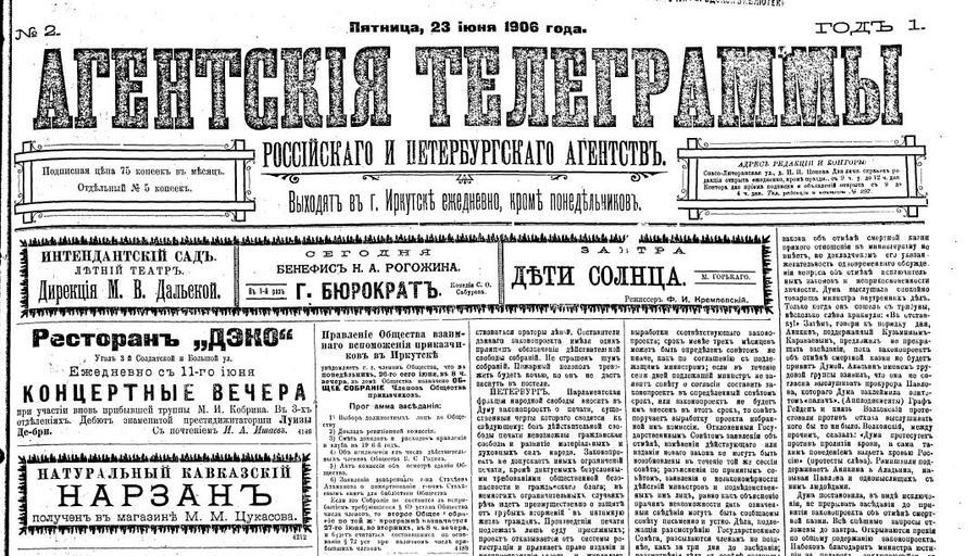 | Keywords: Agentskie telegrammy.jpg ru Газета Агентские телег аммы оссийского и пете бу гских агентств Издавалась в И кутске с 1906 года И кутская го одская библиотека Редакция газеты Агентские телег аммы 1906-06-23 PD-Old Newspapers of Russia 1906 23 June History of Irkutsk Media of Irkutsk Newspapers of Russia to be categorised by name |