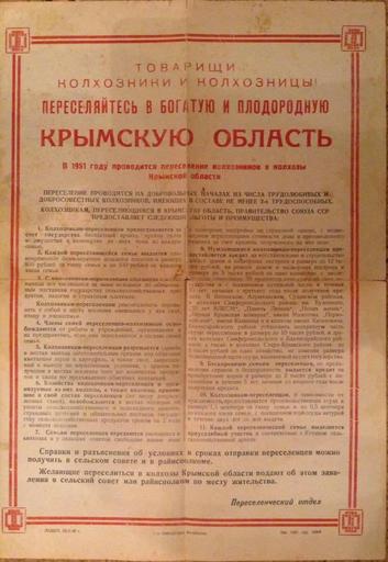 | Keywords: Agitation flyer crimea russians resettlement.jpg en Agitation flyer for Crimea resettlement by Russians Promising benefits and financial aid for new coming Russian families for fertile Crimean region late 1940-ies early 1950-ies uk Агітаційна листівка для заселення К иму осіянами Обіцяюча вигоди і фінансову допомога для нових осійських сімей п и пе еселенні в одючю К имську область кінець 1940-х початок 1950 1951-12-21 http //news online ua/758890/v-rossii-snova-razoblachili-vrane-okkupantov-o-kryme-opublikovan-dokument/ Пе еселенческий отдел п и Совете инист ов СССР 1947 г Resettlement Department under the Council of Ministers of USSR 1947 other versions Benefits of resettlement being regulated by RESOLUTION OF THE USSR Council of Ministers from 21 12 1951 N 5263 about benefits for resettlement for 1952 year Custom license marker 2016 11 16 PD-UA Crimea Documents of Crimea |