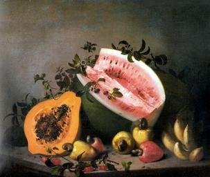 | Keywords: Agostinho da Mota - Mamão e melancia, 1860.jpg Artwork creator Agostinho José da Mota 1860 technique oil canvas cm 53 4 65 Institution Museu Nacional de Belas Artes accession number 758 object history credit line Scan MNBA/Banco Santos catalogue São Paulo 2002 PD-old-auto 1878 Agostinho José da Mota Brazilian paintings in the Museu Nacional de Belas Artes 1860 paintings Still life paintings of melons Carica papaya Still life paintings of fruits 1860s paintings from Brazil 1860 19th-century oil on canvas paintings Oil still life paintings Still life paintings from Brazil 1860s still-life paintings 19th-century paintings in the Museu Nacional de Belas Artes Still life paintings in the Museu Nacional de Belas Artes |
