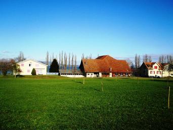 Keywords: agriculture farm meadow young fruit trees idyllic background lake constance altnau thurgau switzerland
