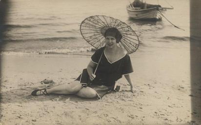 | Keywords: Ahlbeck Postkarte 001.jpg de Frau mit Sonnenschirm am Wasser sitzend http //www zeno org - Zenodot Verlagsgesellschaft mbH A Luckmann Ahlbeck Seebad um 1910 - 1920s Postcards of Ahlbeck Usedom Postcards of women in Germany 1920s postcards Ahlbeck beach 1920s swimwear Paper umbrellas Black and white photographs of sitting women Sitting on ground Sitting holding objects Images from zeno org 1920s photographs Sitting with legs folded sideways | ||||