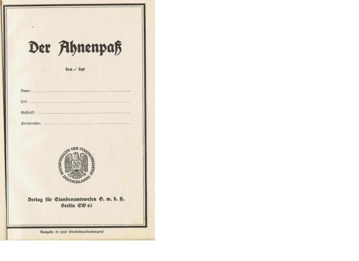 | Keywords: Ahnenpass 002 anonym.png de excerpts from an Aryan certificate by the Reichsverband der Standesbeamten Deutschlands RDSD Union of Registrars of the Reich in Germany 31st Edition with death certificates by Verlag für Standesamtswesen G m b H Berlin SW 61 2014-05-24 00 00 46 own Dudy001 cc-zero Uploaded with UploadWizard Documents associated with the Nazi Holocaust National Socialism | ||||
