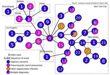 | Keywords: AIDS index case graph.svg A graph of the early onset of AIDS from the alleged index case of Gaëtan Dugas aka Patient Zero Based on information originally published in the American Journal of Medicine March 1984 <br/> References Auerbach DM Darrow WW Jaffe HW Curran JW  1984 Cluster of cases of the acquired immune deficiency syndrome Patients linked by sexual contact Am J Med  76  487 “492 PMID 6608269 DOI 10 1016/0002-9343 84 90668-5 Created in Inkscape<br/> Previously published None 2013-12-17 Niamh O'C Cc-zero Original upload log en wikipedia AIDS_index_case_graph svg wikitable - 2013-12-17 21 09 992×678× 433345 bytes Niamh O'C Kaposi sarcoma is now Kaposi's sarcoma and italicised Text vectorised - 2013-12-17 17 17 992×678× 96857 bytes Niamh O'C minor tweaks - 2013-12-17 17 11 992×678× 96646 bytes Niamh O'C Changed the non-node font to Liberation Sans I didn't like how DejaVu Sans looked when rendered by Wikipedia - 2013-12-17 17 03 992×678× 94124 bytes Niamh O'C Removed a couple of errant flowroots - 2013-12-17 16 57 992×678× 95858 bytes Niamh O'C Uploading a self-made file using File Upload Wizard Uncategorized 2016 May 12 |