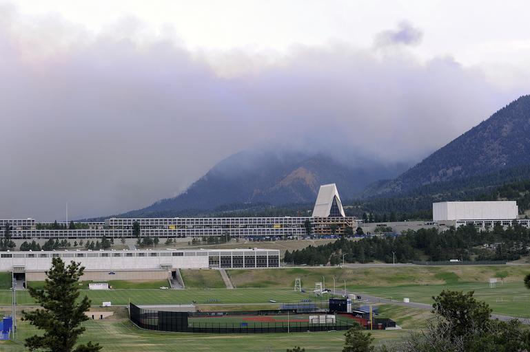 Keywords: air force academy school university college education buildings architecture landscape mountains grass smoke smoke from fire sky clouds athletic field