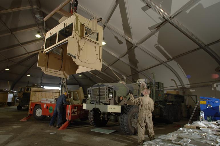 Keywords: Air Force Add-on Armor DVIDS17758.jpg en Balad Air Base Iraq AFPN - Airman 1st Class Roger Hild guides as Staff Sgt Kenneth Pease operates the crane as the upper portion of an Add on Armor AOA cab for a truck tractor is lowered onto the lower armor plated cab section that has already been prepared with floor and firewall plating The add-on-armor kit is a permanent modification This will include new air ride seats and air conditioning since the combat convoys make few if any stops and protective windows are kept shut in the 100+ degrees in the summer The armor provides the driver and gunner added protection against weapons fire and IED explosions Sgt Pease and Amn Hild are deployed to the 732 Expeditionary Logistics Squadron Balad Air Base Iraq The unit is comprised of active duty and reserve component vehicle maintenance technicians who support the Army Field Support Battalion- Iraq The installation of the Level II Add on Armor AOA kits provides a high degree of protection to the troops operating outside the wire Survivors of improvised explosive device explosions often e-mail the unit to give their thanks for them doing such a great armor installation job This the final phase of the AF mission will end with the turnover to contractors in late January 2006 To date the Air Force AoA mission has fielded more than 1 300 Pease and Hild are assigned to the 52nd Logistics Readiness Squadron Spangdahlem Air Base Germany Pease is a native of California City Ca and Hild is from Schertz Tex U S Air Force Photo by Master Sgt Lance Cheung 2006-01-13 Lance Cheung https //www dvidshub net/image/17758 17758 2006-04-03 14 46 BALAD IQ PD-USGov Images from DoD uploaded by Fæ 52d Fighter Wing United States Air Force 332d Air Expeditionary Wing United States Air Force |