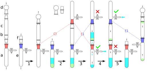 | Keywords: Air-free filtration.svg Air-free filtration <U>Apparatus</U> a receiving Schlenk flask pink joint b glass filter sinter/frit c filter stick d sealing bulb e suspension containing Schlenk flask blue joint f stopper <U>Method</U> 1 Dry apparatus and place under vacuum 2 Place filter stick and receiving flask pink joint on suspension containing flask blue joint Solution blue precipitate green 3 Invert kit light vacuum applied to lower flask top flask sealed Liquid passes through sinter Precipitate trapped on sinter Optionally the precipitate can be washed with fresh solvent 4 Filtration complete remove vacuum and fill with inert gas from top Schlenk flask 5 Remove filter stick to obtain filtered solution blue Note if precipitate green is required this can be collect either i in a glove box or ii by tapping the solid back down into blue jointed Schlenk flask under gravity as shown in the drawing or iii adding a new Schlenk flask to the end of the filter stick which is opposite to the blue jointed Schlenk flask and by washing a dissolving solvent through filter stick to dissolve the precipitate and thereby transfer the precipitate into the fresh Schlenk flask The solvent can then be removed under vacuum Re-drawn from work by Quantockgoblin 2008-06-07 Original PNG by User Quantockgoblin SVG adaptation by User Slashme Image Air-free filtration png Schlenk flasks Filtration |