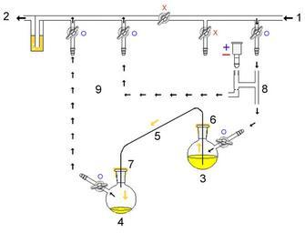 | Keywords: Air sensitive cannula -intra-bleed valve.png Air sensitive cannula - intra-bleed valve 1 Pressure in gas in 2 Pressure out oil bubbler orange 3 Higher flask with transfer liquid yellow to transfer 4 Lower receiving flask/transfered liquid yellow 5 Liquid transfer cannula 6 Septum orange on transfer flask 7 Septum orange on receiving flask 8 Pressure-control regulator/stopcock 9 Tubing/ gas-line not shown for clarity arrows show connectivity <font color blue>O</font> Open stopcock; <font color red>X</font> Closed stopcock; black-arrow Gas flow direction orange arrow Liquid flow direction <br><br> Note As the Pressure-control regulator/stopcock 8 is gradually cloased pressure gradually builts up in flask 3 containing the fluid to be transferred Own Quantockgoblin chemistry Cannula transfer |