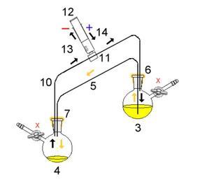 | Keywords: Air sensitive cannula - syringe valve.png Air sensitive cannula - syringe valve 1 png Air sensitive cannula - syringe valve 1 - 2 - 3 Higher flask with transfer liquid yellow to transfer 4 Lower receiving flask/transfered liquid yellow 5 Liquid transfer cannula 6 Septum orange on transfer flask 7 Septum orange on receiving flask 8 - 9 - 10 Gas cannula 11 2-way syringe stopcock 12 Gas-tight syringe 13 Gas/pressure removed from flask 4 14 Gas/pressure added to flask 3 <font color blue>O</font> Open stopcock; <font color red>X</font> Closed stopcock; black-arrow Gas flow direction orange arrow Liquid flow direction <br> Note By use of syringe and two way syringe stop-cock the atmosphere of flask 7 can be forced into the flask 3 which will now be at higher pressure to start the siphon effect Once the siphon effect has started it may be necessary to open the syringe stop-cock to allow the atmospheres to equal Own Quantockgoblin Cannula transfer |