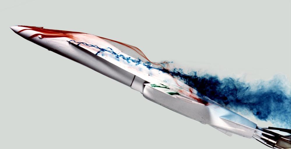 Keywords: aircraft model test military fighter jet water tunnel dye injection fa-18 aviation technology