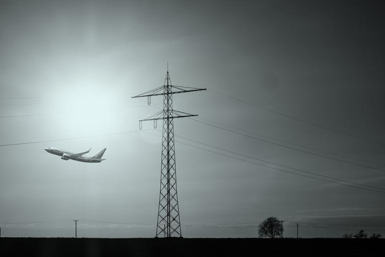 Keywords: aircraft start take off current power poles jet aviation airliner machine boeing flight strommast landscape