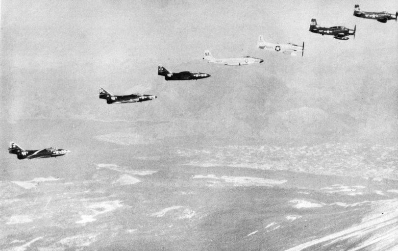| Keywords: Aircraft of US Navy Air Task Group 201 in flight c1956.jpg Aircraft of the U S Navy Air Task Group 201 ATG-201 in flight ATG-201 was assigned to the aircraft carrier USS Bennington CVA-20 for her voyage around South America from 8 September to 20 October 1955 and for the subsequent deployment to the Western Pacific from 31 October 1955 to 16 April 1956 Visible are the following aircraft right to left <br> a Douglas AD-5W Skyraider from Composite Squadron 12 VC-12 Det 30 Bats ; note the aircraft more looks like an AD-6 ; a AD-5N from VC-33 Det 30 Night Hawks ; a AD-6 from Attack Squadron 195 VA-105 Mad Dogs ; a McDonnell F2H-4 Banshee of VC-4 Det 30 Nightcappers ; a Grumman F9F-5 Panther from VA-36 Roadrunners ; a F9F-5P from VC-62 Det 30 Fighting Photos ; a F8F-8 Cougar from Fighter Squadron 13 VF-13 Night Cappers U S Navy photo http //navysite de/cruisebooks/cv20-55/090 htm from the http //navysite de/cruisebooks/cv20-55/index_017 htm USS Bennington CVA-20 1954-1955 cruise book available at http //navysite de/cruisebooks/index html Navysite de ca 1956 USN PD-USGov-Military-Navy United States Navy carrier air wings |