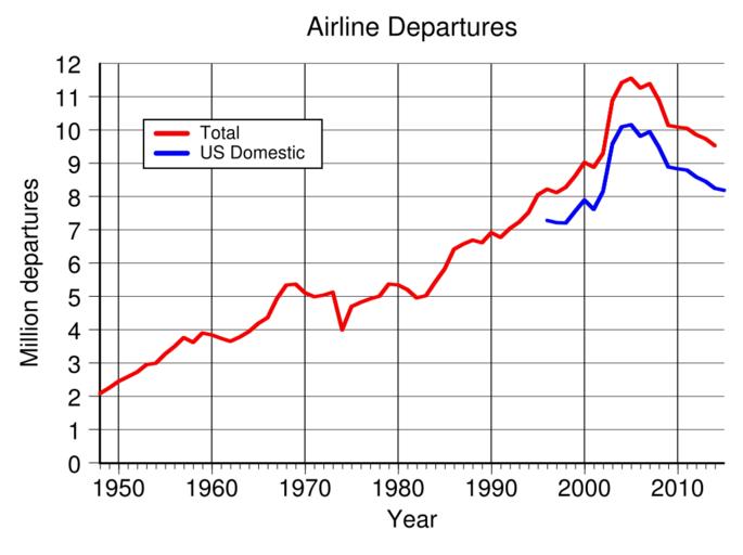 | Keywords: Airline departures.svg en Annual passenger airline departures from 1948 to 2015 Data from http //airlines org/data/annual-results-u-s-airlines-2/ Airlines for America and http //www rita dot gov/bts/acts/customized/table adfy 1996 adfm 1 adty 2016 adtm 12 aos 6 artd 1 arti arts asts astns astt 3 ascc ascp 1 US DOT 2016-04-04 own Delphi234 other versions Generated with Wikimedia SVG Chart SVG Chart/box cc-zero Aviation statistics | ||||