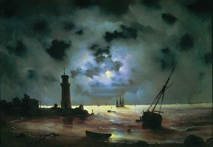 | Keywords: Aivazovsky - Sea coast at night. Near the beacon.jpg Artwork Creator Ivan Aivazovsky Sea coast at night Near the beacon Бе ег мо я ночью У маяка 1837 Oil on canvas Size cm 81 56 Institution Aivazovsky Art Gallery of Feodosiya object history credit line accession number http //aivazovski ru/gal301/ PD-old-100 1837 paintings from Russia Seascapes by Ivan Aivazovsky Paintings of watercraft by Ivan Aivazovsky Paintings of Ivan Aivazovsky in 1830s Seacoasts by Ivan Aivazovsky Location of museum or gallery missing Night in seascape paintings Paintings in Aivazovsky gallery in Feodosia |