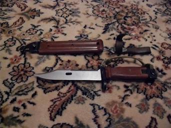 Keywords: Ak bayonett brown open front.jpg en Avtomat Kalashnikov bayonet brown out of sneak front Soviet 2<sup>nd</sup> Model AKM Bayonet de Avtomat Kalashnikov Bayonett braune frei Klinge Vorderseite own RRT877 2010-08-20 AK bayonets