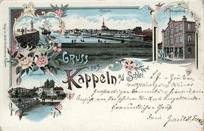 | Keywords: AK Kappeln an der Schlei.jpg Ansichtskarte Gruss aus Kappeln a d Schlei 1897 gelaufen; mit Schleimünde Strandhotel Schauspielhaus http //www ebay de before 1897 anonymous PD-old-70-1923 Images from eBay Kappeln Theaters in Schleswig-Holstein Kappeln |