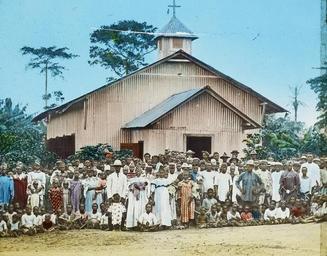 | Keywords: Akaniobio Church, Old Calabar, Calabar, Nigeria, ca. 1900-1910 (IMP-CSWC47-LS9-60).jpg en <br> Akaniobio Church Old Calabar Calabar Nigeria ca 1900-1910 Tinted lantern slide showing the church at Akaniobio in Old Calabar and its large congregation of men women and children Some individuals wear European dress whilst others wear traditional Calabar styles A church was originally built in 1905 by Onoyom Iya Nya a wealthy trader who became a Christian under the work of Mary Mitchell Slessor 1848-1915 However the original church was flooded in 1906 Onoyam Iya Nya built a new church as the centre of a new settlement on higher ground naming the area Obio Usiere or Town of the Dawn It is unclear which church is represented in this image This slide comes from a set on mission culture and industry in Calabar southeast Nigeria generated by the Church of Scotland and the United Free Church of Scotland which was incorporated with the Church of Scotland in 1929 Photographer Unknown Filename IMP-CSWC47-LS9-60 tif Coverage date 1900/1910 Subject unesco Church Part of collection International Mission Photography Archive ca 1860-ca 1960 Part of subcollection Photographs from the Centre for the Study of World Christianity University of Edinburgh U K ca 1900-ca 1940s Repository name Centre for the Study of World Christianity Archival file Volume5/IMP-CSWC47-LS9-60 tif Geographic subject city or populated place Calabar Repository address The University of Edinburgh School of Divinity New College Mound Place Edinburgh EH1 2LX United Kingdom Geographic subject country Nigeria Format aacr2 lantern slides 8 2 x 8 2cm Geographic subject continent Africa Rights Contact the repository for details Part of series Church of Scotland Slide and Visual Collection Calabar Church and Industry CSWC47-LS9 Repository email divinity-CSWC ed ac uk Date created 1900/1910 Publisher of the digital version University of Southern California Libraries Subject aat genre exterior views Format aat lantern slides; photographs Geographic subject state Cross River Access conditions http //www ed ac uk/schools-departments/divinity/research/centres/world-christianity/collections-resources Geographic subject religious facilities File CSWC47/LS9/60 Subject lcsh Church; Presbyterian church 1900/1910 date created author http //digitallibrary usc edu/cdm/ref/collection/p15799coll123/id/78497 PD-old-70-1923 Magic lantern images Images from USC Digital Library uploaded by Fæ International Mission Photography Archive ca 1860-ca 1960 People of Calabar |