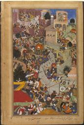 | Keywords: Akbar shoots Jaimal at the siege of Chitor.jpg en The fall of the Rajasthani fortress of Chitor in 1568 when the Mughal army succeeded in approaching the ramparts by constructing covered defences As Akbar surveyed the battle one evening he took aim with his gun at a figure in the fort whose studded coat indicated that he was a leading enemy soldier The shot killed the man who was discovered to be the Rajput hero Jaimal The covered lines of attack built by the Mughals allow the army including armoured elephants centre left to approach the walls of the fortress shown upper left Akbar is shown top right holding the gun called Sangram with which he has just shot a figure in a studded coat The figure is Jaimal the general of the enemy army and the fortress submitted soon afterwards to the Mughal forces V A Museum 1590 -1596 Akbarnama http //warfare2 likamva in/Moghul/Akbar/1568-Akbar_shoots_Jaimal_at_the_siege_of_Chitor htm Abul Fazl V A Museum PD-Art Uploaded with UploadWizard Military history of the Mughal Empire Paintings of Akbar the Great 1590s paintings from India 1568 in India Akbarnama |