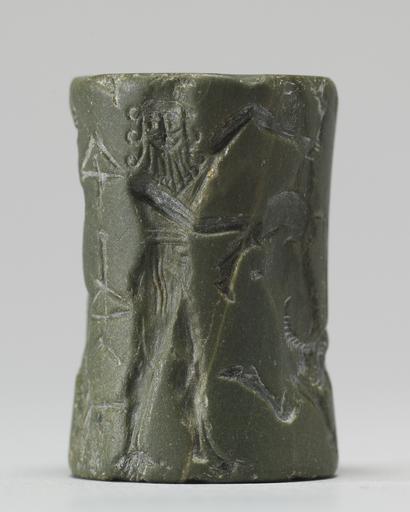 | Keywords: Akkadian - Cylinder Seal with King or God and Vanquished Lion - Walters 42674 - Side B.jpg The scene on this seal features a central motif of a tree On one side a bearded hero is holding an inverted bovid; on the other a bull man is holding an inverted lion There are cuneiform inscriptions running through the scene in two places La escena en este sello muestra un adorno central de un árbol Por un lado un héroe barbudo esta sujetando un bóvido invertido por el otro lado un hombre toro esta sujetando un león invertido Hay inscripciones cuneiformes a lo largo de la escena en dos áreas date Old Akkadian green stone Diam cm 2 1 accession number 42 674 4594 Sadie Jones Mrs Henry Walters New York date and mode of acquisition unknown Sale Joseph Brummer New York 1941 Walters Art Museum 1941 by purchase Museum purchase 1941 Inscription place of origin Egypt Walters Art Museum license Akkadian cylinder seals Cylinder seals in the Walters Art Museum Bulls in art Bull of Heaven Gilgamesh Epic of Gilgamesh Animals in art of the ancient Near East Walters cylinder seal 42674 Cuneiform on cylinder seals Walters Art Museum cylinder seals with cuneiform Media contributed by the Walters Art Museum needs category review Master of Animals |