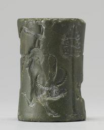 | Keywords: Akkadian - Cylinder Seal with King or God and Vanquished Lion - Walters 42674 - Side C.jpg The scene on this seal features a central motif of a tree On one side a bearded hero is holding an inverted bovid; on the other a bull man is holding an inverted lion There are cuneiform inscriptions running through the scene in two places La escena en este sello muestra un adorno central de un árbol Por un lado un héroe barbudo esta sujetando un bóvido invertido por el otro lado un hombre toro esta sujetando un león invertido Hay inscripciones cuneiformes a lo largo de la escena en dos áreas date Old Akkadian green stone Diam cm 2 1 accession number 42 674 4594 Sadie Jones Mrs Henry Walters New York date and mode of acquisition unknown Sale Joseph Brummer New York 1941 Walters Art Museum 1941 by purchase Museum purchase 1941 Inscription place of origin Egypt Walters Art Museum license Akkadian cylinder seals Cylinder seals in the Walters Art Museum Bulls in art Bull of Heaven Animals in art of the ancient Near East Walters cylinder seal 42674 Cuneiform on cylinder seals Walters Art Museum cylinder seals with cuneiform Media contributed by the Walters Art Museum needs category review |