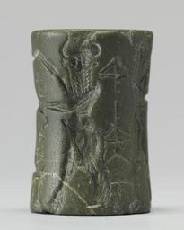 | Keywords: Akkadian - Cylinder Seal with King or God and Vanquished Lion - Walters 42674 - Side G.jpg The scene on this seal features a central motif of a tree On one side a bearded hero is holding an inverted bovid; on the other a bull man is holding an inverted lion There are cuneiform inscriptions running through the scene in two places La escena en este sello muestra un adorno central de un árbol Por un lado un héroe barbudo esta sujetando un bóvido invertido por el otro lado un hombre toro esta sujetando un león invertido Hay inscripciones cuneiformes a lo largo de la escena en dos áreas date Old Akkadian green stone cm 2 1 accession number 42 674 4594 Sadie Jones Mrs Henry Walters New York date and mode of acquisition unknown Sale Joseph Brummer New York 1941 Walters Art Museum 1941 by purchase Museum purchase 1941 Inscription place of origin Egypt Walters Art Museum license Akkadian cylinder seals Cylinder seals in the Walters Art Museum Gilgamesh Epic of Gilgamesh Lions in art of the ancient Near East Walters cylinder seal 42674 Cuneiform on cylinder seals Cuneiform on media Walters Art Museum cylinder seals with cuneiform Media contributed by the Walters Art Museum needs category review |