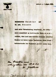 | Keywords: Aktion brand.jpg Hitler's order for the žAktion T4 which led to 70 000 people being killed Own 2008-03-09 Marcel picture taken at nuernberg documentation-center museum On Adolf Hitler's personal stationary the edict reads žReichsleiter Bouhler und Dr med Brandt sind unter Verantwortung beauftragt die Befugnisse namentlich zu bestimmender Ärzte so zu erweitern dass nach menschlichem Ermessen unheilbar Kranken bei kritischster Beurteilung ihres Krankheitszustandes der Gnadentod gewährt werden kann -- A Hitler The handwitten comment reads Von Bouhler mir übergeben am 27 8 40 - Dr Gürtner English given to me by Bouhler on 27 8 August 1940; Dr Gürtner Franz Gürtner was Minister for Justice Reichsjustizminister from 1932 to his death in 1941 Philipp Bouhler was a SS-Obergruppenführer and leader of Hilter's Chancellery Kanzlei des Führers; KdF Karl Brandt Letters written messages 1939-09-01 Documents associated with World War II Action T4 |