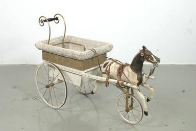 | Keywords: Åkvagn m häst, snett framifrån - Livrustkammaren - 13909.tif Liten vagn bestående av vagnskorg och en förspänd häst med seldon i miniatyr Vagnskorgen är försedd med handtag och kan dras som en barnvagn Den lille prinsen eller prinsessan kunde sitta i vagnen och samtidigt hålla i tömmarna Ekipaget rullar på tre hjul <br/><br/>Vagnskorg målad i vitt och guld bestående av två delar Den nedre delen är en trälåda där de vita fälten ramas in av målade guldlinjer På detta är fastsatt en överdel av korg med en målad 110 mm hög guldbård Kanterna på korgen är upptill omvikta och vitmålade Hela vagnskorgen är vitmålad inuti I trälådans sarg är fastskruvat en ställning av metall målad med guldfärg Över vagnskorgens bakre del sträcker sig två 250 mm höga stänger som bildar två voluter mellan vilka ett mörkt balusterformat trähandtag är fastskruvat Två 180 mm långa vita lister är fastsatta längs med vagnskorgens långsidor ca 20 mm ner från sargkanten Troligtvis har de använts som stöd för en nu försvunnen bänk där barnet har kunnat sitta Vagnskorgen är försedd med två stora hjul diam 510 mm med guldmålade ekrar och hjulskenor <br/><br/>Från vagnskorgen löper skaklar fram till hästen - en vit skäck med bruna fläckar och ögon av glas Hästens stomme består av trä Till denna har skarvats ihop delar av päls och skinn som sedan sytts ihop Svanens är gjord av grått tagel Manen består numera endast av några få strån Seldonen är i form av huvudlag och s k bröstsele bestående av däckel med tre tömlöpare ryggstycke svansrem och hintertyg brösta saknas Tömmarna löper genom de två yttersta tömlöparna fram till huvudlaget Till huvudlaget hör nackrem pannrem käkrem sidorem och körstång Hästen har skygglappar framför ögonen <br/>Både bröstsele och huvudlag är av brunt läder medmetalldetaljer <br/><br/>Hästen bärs upp av två tunna metallskenor mellan skaklarna Under hästens mage finns även en grövre guldmålad metallställning som förbinder hästen och skaklarna med det hjul som bär upp vagnens främre del Hjulet är av samma modell som föregående men något mindre 310 mm i diam original caption åkvagn m häst snett framifrån ca 1906 size mm 510 hjul bak size mm 310 hjul fram size mm 800 size mm 340 korg ö marken size mm 400 vagnskorg size mm 800 mellan hjulnav size mm 600 största size mm 930 största size mm 1450 g 19000 LRK Hästen 1977 Prinsessor place of origin original filename lm_dig0638 52187 inventory number LRK 15620 13909 CC-BY-SA Samuel Uhrdin <gallery caption Different images of same object > File Åkvagn m häst höger sida - Livrustkammaren - 22472 tif File Åkvagn m häst vänster sida - Livrustkammaren - 31034 tif </gallery> Samuel Uhrdin Horse equipment Media contributed by LSH dim-with multiple size templates Color images from Livrustkammaren Media contributed by LSH 2013-10 |
