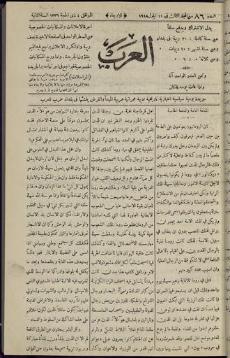 | Keywords: Al-Arab, Volume 3, Number 86, September 11, 1918 WDL12581.jpg Artwork ru Анистас а и аль-Ка мили 1866 1947 fr Anistās Mārī al-Karmilī ab 1866-1947 en Anistās Mārī al-Karmilī ab 1866-1947 zh 阿尼斯塔斯·玛里·卡尔密里,1866-1947 年 pt Anistās Mārī al-Karmilī ab 1866 a 1947 ar أنستاس ماري، الكرملي، الأب، 1866-1947 es Anistās Mārī al-Karmilī ab 1866-1947 ru Аль-А аб том 3 86 11 сентяб я 1918 года fr Al-Arab volume 3 n° 86 11 septembre 1918 en Al-Arab Volume 3 Number 86 September 11 1918 zh 阿拉伯人报 ,第 3 卷,第 86 ,1918 年 9 11 日 pt Al-Arab Volume 3 Número 86 11 de setembro de 1918 ar العرب، المجلد الثالث، العدد السادس والثمانون، 11 سبتمبر 1918 ru Газета <em> Аль-А аб </em> А абы впе вые вышла в Багдаде 4 июля 1917 года спустя п име но четы е месяца после того как б итанские войска отвоевали го од у ту ок тем самым освободив его от т ехвекового господства Османской импе ии Газета появилась в пе еломный пе иод в исто ии И ака Она выпускалась б итанскими властями и служила упо ом б итанской админист ации на фоне поднимающейся волны и акского и а абского национализма В ней османские ту ки п едставлялись иноземцами а б итанцы освободителями и п едп инимались попытки асши ить влияние б итанской военной и политической ст атегии нап авленной п отив Османской импе ии в Пе вой ми овой войне И название и печатаемые на пе вой ст анице выходные данные в кото ых газета называлась а абской по своей сути и целям уч ежденной в Багдаде а абами и для а абов и публикуемые в газете мате иал все в газете было нап авлено на фо ми ование об аза местного издания отстаивающего инте есы а абского населения В пе едовице пе вого номе а ту ки были названы сыновьями Гога и агога желающими ист ебить а абов этот доб ый на од кото ый в п ошлом внес неоценимый вклад в дело п иумножения знания и п ог есса ми ного сосуществования и гуманизма ате иалы издания были посвящены таким темам как политика новости исто ия и лите ату а Редакто ом газеты был ученый и богослов Анистас аль-Ка мили и акский х истианин ливанского п оисхождения Поначалу газета Аль-А аб выходила каждые два дня но начиная с 28-го номе а стала публиковаться ежедневно к оме воск есенья Вначале она состояла из двух ст аниц пе иодически дополнявшихся п иложениями но начиная с 1 янва я 1918 года стала печататься на четы ех ст аницах В мае 1920 года она пе естала издаваться и ее заменила газета Аль-И ак И ак пе вый номе кото ой увидел свет 1 июня 1920 года <br>Экономические условия; Лите ату а; Политика и уп авление fr Le journal <em>Al-Arab</em> parut pour la première fois à Bagdad le 4 juillet 1917 quatre mois environ après la prise de la ville jusque-là sous la domination des Turcs par les troupes britanniques mettant fin à trois siècles d'emprise ottomane Le journal créé à une période critique de l'histoire de l'Irak était publié par les autorités britanniques et leur servait de porte-parole alors que le nationalisme irakien et arabe était en pleine ascension Dépeignant les Ottomans comme des étrangers et les Britanniques comme des libérateurs le journal avait pour objectif de développer la stratégie politique et militaire britannique contre les Ottomans pendant la Première Guerre mondiale Le titre l'ours qui déclarait que le journal fut « établi avec des principes et des objectifs arabes à Bagdad par des Arabes pour les Arabes » et le contenu visaient à souligner son caractère local et son allégeance arabe Un éditorial paru dans le premier numéro décrit les Turcs comme des « fils de Gog et Magog cherchant à annihiler les Arabes ce grand peuple qui œuvra autrefois de façon mémorable en faveur du savoir du progrès de la cohabitation et de l'humanité » Le journal abordait des sujets tels que la politique l'actualité l'histoire et la littérature Irakien chrétien d'origine libanaise le théologien et érudit Anistās al-Karmilī en était l'éditeur <em>Al-Arab</em> paraissait initialement tous les deux jours puis à partir du numéro 28 il fut publié tous les jours sauf le dimanche Le quotidien comportait d'abord 2 pages et parfois des suppléments mais il passa à 4 pages le 1<sup>er</sup> janvier 1918 Il cessa d'exister en mai 1920 Il fut remplacé par le journal <em>Al-Irak</em> dont le premier numéro parut le 1<sup>er</sup> juin 1920 <br>Conjoncture économique; Littérature; Politique et gouvernement en The newspaper<em> Al-Arab</em> The Arabs