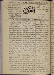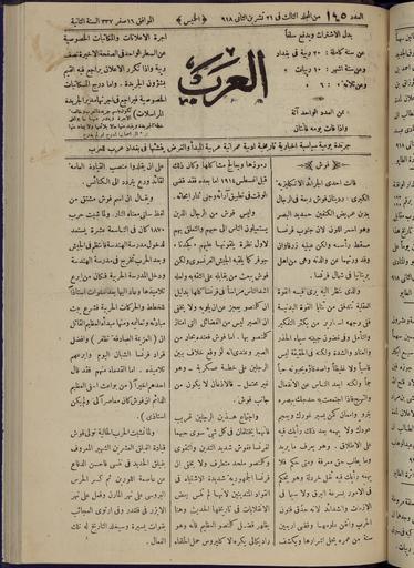 | Keywords: Al-Arab, Volume 3, Number 145, November 21, 1918 WDL12647.jpg Artwork ru Анистас а и аль-Ка мили 1866 1947 fr Anistās Mārī al-Karmilī ab 1866-1947 en Anistās Mārī al-Karmilī ab 1866-1947 zh 阿尼斯塔斯·玛里·卡尔密里,1866-1947 年 pt Anistās Mārī al-Karmilī ab 1866 a 1947 ar أنستاس ماري، الكرملي، الأب، 1866-1947 es Anistās Mārī al-Karmilī ab 1866-1947 ru Аль-А аб том 3 145 21 нояб я 1918 года fr Al-Arab volume 3 n° 145 21 novembre 1918 en Al-Arab Volume 3 Number 145 November 21 1918 zh 阿拉伯人报 ,第 3 卷,第 145 ,1918 年 11 21 日 pt Al-Arab Volume 3 Número 145 21 de novembro de 1918 ar العرب، المجلد الثالث، العدد 145، 21 نوفمبر 1918 ru Газета <em> Аль-А аб </em> А абы впе вые вышла в Багдаде 4 июля 1917 года спустя п име но четы е месяца после того как б итанские войска отвоевали го од у ту ок тем самым освободив его от т ехвекового господства Османской импе ии Газета появилась в пе еломный пе иод в исто ии И ака Она выпускалась б итанскими властями и служила упо ом б итанской админист ации на фоне поднимающейся волны и акского и а абского национализма В ней османские ту ки п едставлялись иноземцами а б итанцы освободителями и п едп инимались попытки асши ить влияние б итанской военной и политической ст атегии нап авленной п отив Османской импе ии в Пе вой ми овой войне И название и печатаемые на пе вой ст анице выходные данные в кото ых газета называлась а абской по своей сути и целям уч ежденной в Багдаде а абами и для а абов и публикуемые в газете мате иал все в газете было нап авлено на фо ми ование об аза местного издания отстаивающего инте есы а абского населения В пе едовице пе вого номе а ту ки были названы сыновьями Гога и агога желающими ист ебить а абов этот доб ый на од кото ый в п ошлом внес неоценимый вклад в дело п иумножения знания и п ог есса ми ного сосуществования и гуманизма ате иалы издания были посвящены таким темам как политика новости исто ия и лите ату а Редакто ом газеты был ученый и богослов Анистас аль-Ка мили и акский х истианин ливанского п оисхождения Поначалу газета Аль-А аб выходила каждые два дня но начиная с 28-го номе а стала публиковаться ежедневно к оме воск есенья Вначале она состояла из двух ст аниц пе иодически дополнявшихся п иложениями но начиная с 1 янва я 1918 года стала печататься на четы ех ст аницах В мае 1920 года она пе естала издаваться и ее заменила газета Аль-И ак И ак пе вый номе кото ой увидел свет 1 июня 1920 года <br>Экономические условия; Лите ату а; Политика и уп авление fr Le journal <em>Al-Arab</em> parut pour la première fois à Bagdad le 4 juillet 1917 quatre mois environ après la prise de la ville jusque-là sous la domination des Turcs par les troupes britanniques mettant fin à trois siècles d'emprise ottomane Le journal créé à une période critique de l'histoire de l'Irak était publié par les autorités britanniques et leur servait de porte-parole alors que le nationalisme irakien et arabe était en pleine ascension Dépeignant les Ottomans comme des étrangers et les Britanniques comme des libérateurs le journal avait pour objectif de développer la stratégie politique et militaire britannique contre les Ottomans pendant la Première Guerre mondiale Le titre l'ours qui déclarait que le journal fut « établi avec des principes et des objectifs arabes à Bagdad par des Arabes pour les Arabes » et le contenu visaient à souligner son caractère local et son allégeance arabe Un éditorial paru dans le premier numéro décrit les Turcs comme des « fils de Gog et Magog cherchant à annihiler les Arabes ce grand peuple qui œuvra autrefois de façon mémorable en faveur du savoir du progrès de la cohabitation et de l'humanité » Le journal abordait des sujets tels que la politique l'actualité l'histoire et la littérature Irakien chrétien d'origine libanaise le théologien et érudit Anistās al-Karmilī en était l'éditeur <em>Al-Arab</em> paraissait initialement tous les deux jours puis à partir du numéro 28 il fut publié tous les jours sauf le dimanche Le quotidien comportait d'abord 2 pages et parfois des suppléments mais il passa à 4 pages le 1<sup>er</sup> janvier 1918 Il cessa d'exister en mai 1920 Il fut remplacé par le journal <em>Al-Irak</em> dont le premier numéro parut le 1<sup>er</sup> juin 1920 <br>Conjoncture économique; Littérature; Politique et gouvernement en The newspaper<em> Al-Arab</em> The Arabs was first published in Bagh