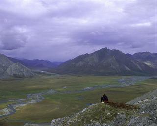 Keywords: alaska landscape mountains sky clouds valley ravine person rocks rocky nature outside scenic vista country countryside remote wilderness summer spring plants tundra grass