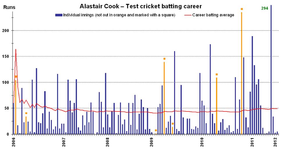 | Keywords: Alastair Cook test batting career v1.png This graph details the w Test Cricket test match performance of cricketer w Alastair Cook and was created by en wiki w user EdChem Each bar indicates a single test match innings blue ones for innings in which he was dismissed orange ones marked with a square for innings in which he batted but was not out The red line shows his career batting average as at the end of each innings An alternative version w File Alastair Cook test batting career v2 png instead shows his 10 innings moving average <p>The graph was generated with Microsoft Excel 2003 the resulting chart being copied to Adobe Photoshop 9 and saved in png format using data from w Cricinfo http //stats espncricinfo com/ci/engine/player/11728 html class 1;template results;type batting;view innings and w Howstat http //www howstat com au/cricket/Statistics/Players/PlayerProgressBat asp PlayerID 3349 This version is current as at 24 January 2012 which is also the date it was prepared This graph details the test match performance of cricketer w Alastair Cook and was created by en wiki w user EdChem Each bar indicates a single test match innings blue ones for innings in which he was dismissed orange ones marked with a square for innings in which he batted but was not out The red line shows his career batting average as at the end of each innings An alternative version w File Alastair Cook test batting career v2 png instead shows his 10 innings moving average <p>The graph was generated with Microsoft Excel 2003 the resulting chart being copied to Adobe Photoshop 9 and saved in png format using data from w Cricinfo http //stats espncricinfo com/ci/engine/player/11728 html class 1;template results;type batting;view innings and w Howstat http //www howstat com au/cricket/Statistics/Players/PlayerProgressBat asp PlayerID 3349 This version is current as at 24 January 2012 which is also the date it was prepared 2012-01-24 own EdChem talk Uploads other versions Convert to SVG graph EdChem wikipedia en Cc-zero Original upload log page en wikipedia Alastair+Cook+test+batting+career+v1 png wikitable - 2012-01-24 07 38 54 1220× 647× EdChem This graph details the test match performance of cricketer Alastair Cook and was created by en wiki user EdChem Each bar indicates a single test match innings blue ones for innings in which he was dismissed orange ones marked - Uncategorized 2016 July 24 |
