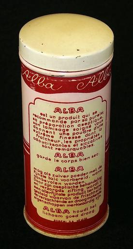 MAKE A MEME View Large Image Alba baby & toilet poeder blikje, foto3.JPG Very old Dutch product that is not produced and/or not sold any more own 2014-03-14 11 11 16 Alf van Beem CC-zero Trademarked Talcum powder tins