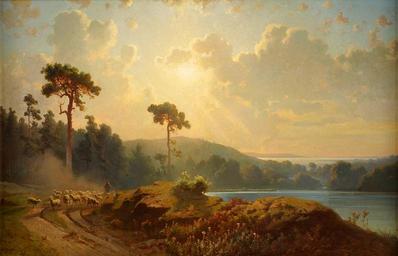 Keywords: Albert Dreßler Seenlandschaft 1868.jpg Seenlandschaft Signiert Datiert Berlin 18 68 Öl auf Leinwand 46 x 72 cm http //www duesseldorfer-auktionshaus de/ Düsseldorfer Auktionshaus 1868 Creator Albert Dreßler PD-old-auto-1923 1897 Images from Düsseldorfer Auktionshaus Albert Dreßler 1868 paintings Landscape paintings Paintings of sheep