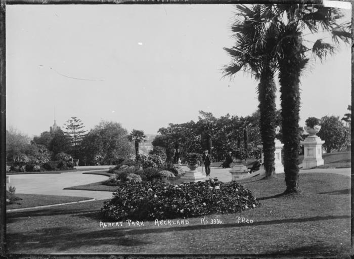 | Keywords: blackandwhite monochrome outdoor photo border palm tree tree plant black and white General view of the gardens looking towards the city and taken in the vicinity of the fountain and the statute of Queen Victoria. Chinese fan palms can be seen in the immediate foreground to the right. Behind these are garden steps with concrete plinths and urns on each side. A man with a walking stick is in the middle distance. Photographed by William A Price ca 1908-1910 Inscriptions: Inscribed - Photographer's title on negative -bottom centre: Albert Park. Auckland. No 3336. P.P.Co.. Quantity: 1 b&w original negative(s). Physical Description: Dry plate glass negative 4.5 x 6.5 inches Albert Park, Auckland. Price, William Archer, 1866-1948 :Collection of post card negatives. Ref: 1/2-001641-G. Alexander Turnbull Library, Wellington, New Zealand. natlib.govt.nz/records/22835033 General view of the gardens looking towards the city and taken in the vicinity of the fountain and the statute of Queen Victoria. Chinese fan palms can be seen in the immediate foreground to the right. Behind these are garden steps with concrete plinths and urns on each side. A man with a walking stick is in the middle distance. Photographed by William A Price ca 1908-1910 Inscriptions: Inscribed - Photographer's title on negative -bottom centre: Albert Park. Auckland. No 3336. P.P.Co.. Quantity: 1 b&w original negative(s). Physical Description: Dry plate glass negative 4.5 x 6.5 inches Albert Park, Auckland. Price, William Archer, 1866-1948 :Collection of post card negatives. Ref: 1/2-001641-G. Alexander Turnbull Library, Wellington, New Zealand. natlib.govt.nz/records/22835033 |