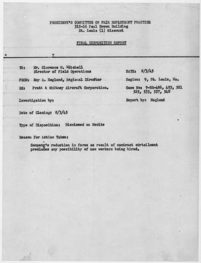| Keywords: Alberta Hadley (Case 9-BR-521), Final Disposition Report - NARA - 292375.tif Scope and content Details final actions taken in the case General notes 292375 Local identifier Office for Emergency Management Committee on Fair Employment Practice Division of Field Operations Region IX 11/11/1943 - 06/28/1946 NARA's Central Plains Region Kansas City NREA 400 West Pershing Road Kansas City MO 64108 1945-08-03 Record group Record Group 228 Records of the Committee on Fair Employment Practice 1940 - 1946 Record group ARC 555 Pratt Whitney Plant Kansas City Mo Closed Case Files compiled 05/03/1943 - 10/02/1945 Series ARC 292229 File unit Alberta Hadley Case 9-BR-521 05/08/1945 - 08/03/1945 File unit ARC 292370 Variant control numbers NAIL Control Number NRE-228-REG9CRCFPW-K-5 yes Other versions NARA-cooperation PD-USGov Check categories-NARA 2011 September 18 Documents in English |