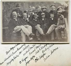 | Keywords: gruppe alene gruppealene thomas j. heftye thomasjheftye thomas heftye thomasheftye heftye thomas johannessen heftye thomasjohannessenheftye stener rosenberg stenerrosenberg chr. schlytter chrschlytter fredrik næser fredriknæser randers niels a. nicolaysen nielsanicolaysen michael muller michaelmuller herman severin løvenskiold hermanseverinløvenskiold christian carl otto lasson christiancarlottolasson hartvig marcus lassen hartvigmarcuslassen joahn carl keyser joahncarlkeyser vincent ihlen vincentihlen jørgen haslef heftye jørgenhaslefheftye holger collett holgercollett johan henrik andresen johanhenrikandresen 16. juli 1865, &quot;herrelag&quot; i anledning Stener Rosenbergs 47-årsdag. På bildet Bakerste rekke: Collett, Rosenberg, Lasson, Müller, Ihlen, Nicolaysen, Lassen. Første rekke: Løvenskiold, Randers, Keyser, Jørgen Heftye, Schlytter og Andresen. Mer om disse karene: - Andresen, Johan Henrik (1815 - 1874, foretningsmann. Kjøpte J. L. Tiedemans tobaksfabrik i 1849) - Collett, Holger (1807 - 1870, dikter, kammerherre, eidsvollsmann) - Heftye, Jørgen Haslef (1828 - 1900, Thomas’ bror) - Ihlen, Vincent (Ihlen var et skogeiernavn fra Lørenskog??) - Keyser, Johan Carl (1827 - 1904 - teolog og skolemann - var huslærer for Peder Anker Wedel jarlsberg)) - Lassen, Hartvig Marcus (1824 - 1897, litteraturhistoriker, redaktør og lærebokforfatter) - Lasson, Christian Carl Otto (1830 - 1893, far til Oda Krohg og Bokken Lasson, regjeringsadvokat og kulturinteressert) - Løvenskiold, Herman Severin (gift med Thomas’ kusine Johanne &quot;Mimsi&quot;) - Muller, Michael - Nicolaysen, Niels A. (1832 - ? ) Høyesterettsadvokat - Randers (brigader?) - Rosenberg, Stener (1818 - ?) grosserer, &quot;hedersgjest&quot;) - Schlytter, Chr. (På turen, men ikke på bildet) - Fredrik Næser (gift med Thomas’ søster) - W. Rosenberg Se også hilsen fra den samme gjengen i gjestebok nr 1; &lt;a www.flickr.com/photos/133429043@N02/17724710069/in/album-... Kilde for personer på bildet: oslobilder.no/OMU/OB.NW4596 16. juli 1865, "herrelag" i anledning Stener Rosenbergs 47-årsdag. På bildet Bakerste rekke: Collett, Rosenberg, Lasson, Müller, Ihlen, Nicolaysen, Lassen. Første rekke: Løvenskiold, Randers, Keyser, Jørgen Heftye, Schlytter og Andresen. Mer om disse karene: - Andresen, Johan Henrik (1815 - 1874, foretningsmann. Kjøpte J. L. Tiedemans tobaksfabrik i 1849) - Collett, Holger (1807 - 1870, dikter, kammerherre, eidsvollsmann) - Heftye, Jørgen Haslef (1828 - 1900, Thomas’ bror) - Ihlen, Vincent (Ihlen var et skogeiernavn fra Lørenskog??) - Keyser, Johan Carl (1827 - 1904 - teolog og skolemann - var huslærer for Peder Anker Wedel jarlsberg)) - Lassen, Hartvig Marcus (1824 - 1897, litteraturhistoriker, redaktør og lærebokforfatter) - Lasson, Christian Carl Otto (1830 - 1893, far til Oda Krohg og Bokken Lasson, regjeringsadvokat og kulturinteressert) - Løvenskiold, Herman Severin (gift med Thomas’ kusine Johanne "Mimsi") - Muller, Michael - Nicolaysen, Niels A. (1832 - ? ) Høyesterettsadvokat - Randers (brigader?) - Rosenberg, Stener (1818 - ?) grosserer, "hedersgjest") - Schlytter, Chr. (På turen, men ikke på bildet) - Fredrik Næser (gift med Thomas’ søster) - W. Rosenberg Se også hilsen fra den samme gjengen i gjestebok nr 1; <a www.flickr.com/photos/133429043@N02/17724710069/in/album-... Kilde for personer på bildet: oslobilder.no/OMU/OB.NW4596 |
