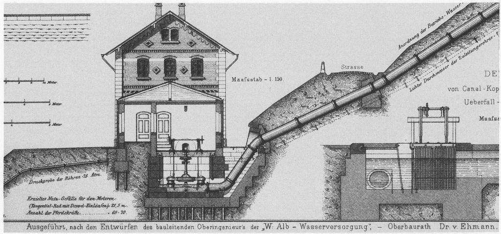 Keywords: Albwasserversorgung pumpwerk eybtal.jpg Swabian Alb drinking water supply plan of a pumping station Eybtal using a turbine precursor Schwäbische Alb Albwasserversorgung Plan des Pumpwerks Eybtal mit Tangential-Rad Scanned by Density ca 1880 Karl Ehmann Water pumping stations Pumphouses in Baden-Württemberg PD-old |