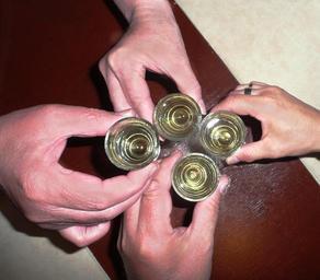 Keywords: alcohol brandy prost to well abut hands togetherness friends drink short