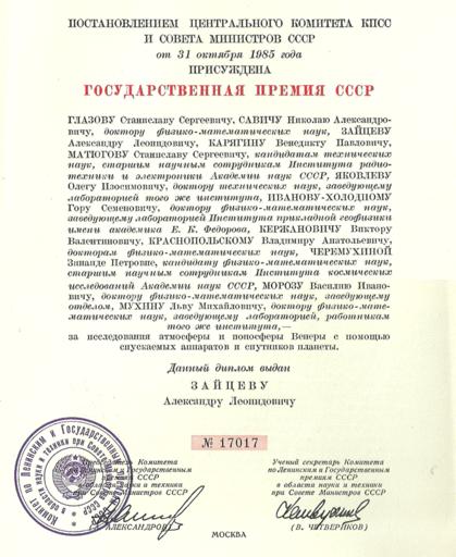 | Keywords: Aleksandr Leonidovich Zaitsev Gos-premia.png ru Диплом лау еата Госуда ственной п емии 2011-09-09 from Aleksandr Leonidovich Zaitsev ЦК КПСС и Совет инист ов СССР PD-RU-exempt Space program of the Soviet Union and Russia Astrophysics Aleksandr Leonidovich Zaitsev Original upload log wikitable - - 2011-09-09 07 09 41 703 × 860 238308 bytes Rumlin ' |