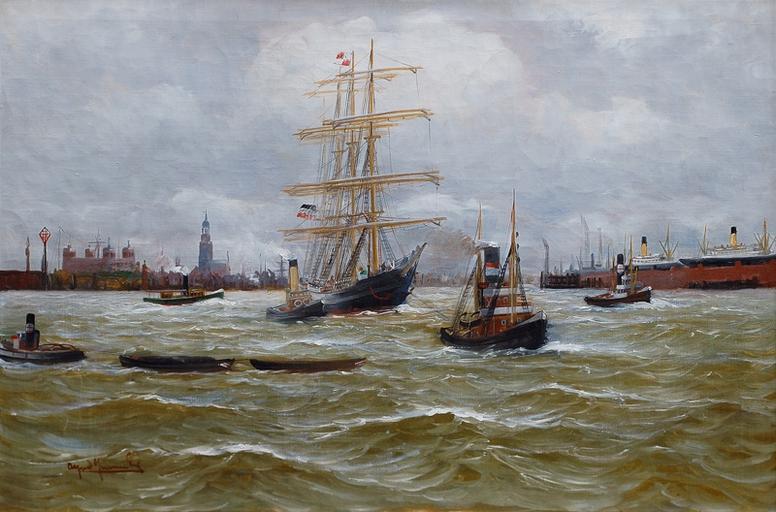 View Original:Alfred_Jensen_-_Dreimaster_und_Schlepper_im_Hamburger_Hafen.jpg (800x528)