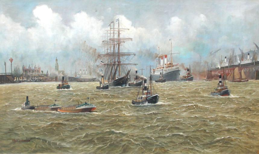 | Keywords: Alfred Jensen - Hafenansicht von Hamburg mit Werft.jpg Artwork Creator Alfred Jensen Monumentale Hafenansicht von Hamburg mit Werft Dock Blohm und Voss sowie diversen unterschiedlich großen Dampfern Segelschiffen und Kuttern Bravo Preussen Seeadler Monte Sarmiento u a oil canvas cm 118 199 object history ~ lower left signature http //www lot-tissimo com/de/i/8800070/p/50/ Auktionshaus Mars Würzburg 24 01 2015 Los 2031 via Lot-tissimo Other versions PD-old-auto-1923 1935 DEFAULTSORT Jensen Alfred; Marine Hamburg; Auktionshaus Mars 2015 Alfred Jensen marine painter Port of Hamburg in art Oil paintings of watercraft 19th-century sailing ships in paintings Oil paintings of seascapes |